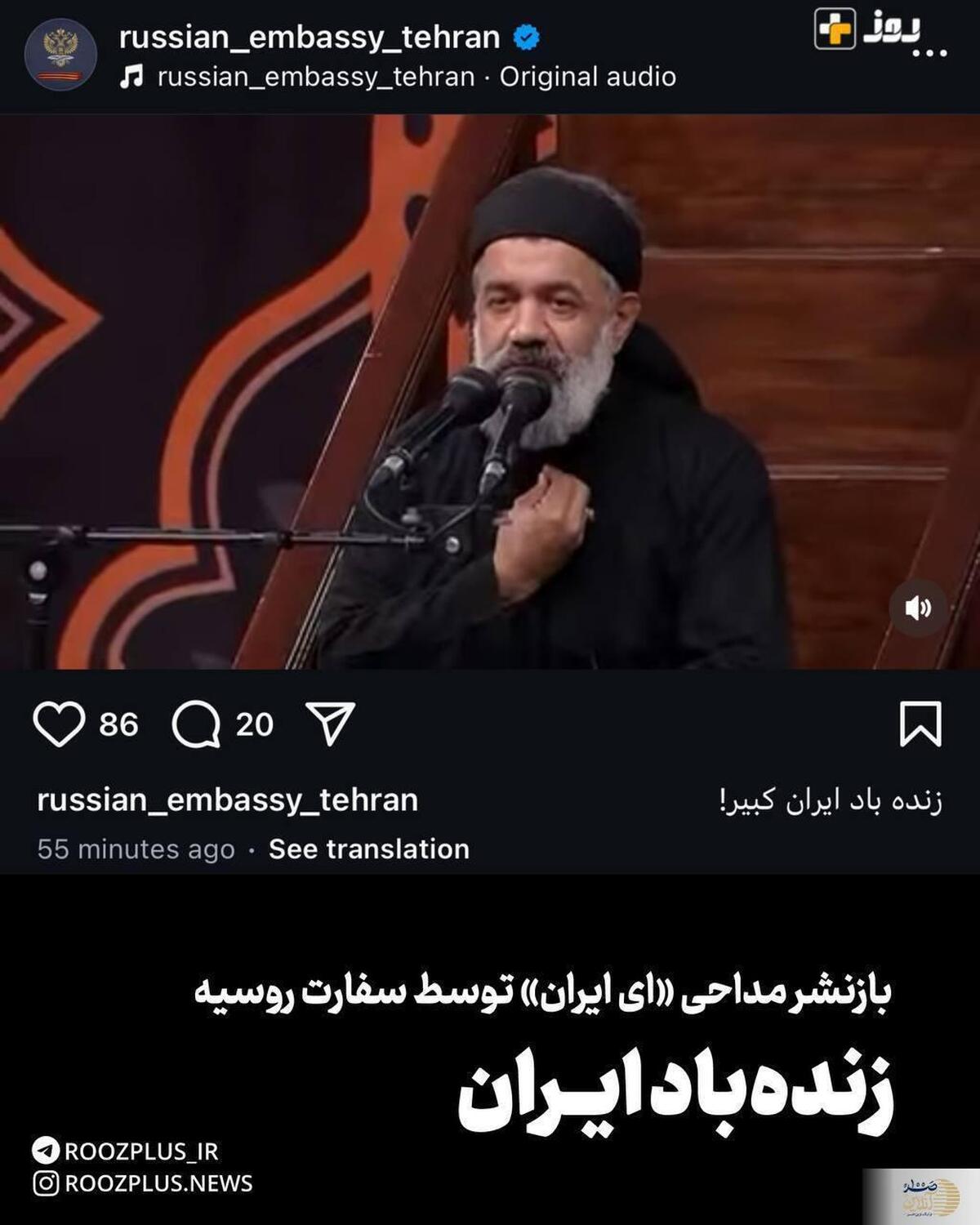 ویدیو صد آنلاین| صفحه رسمی سفارت روسیه در ایران مداحی «ای ایران» توسط محمود کریمی در حضور رهبر معظم انقلاب را بازنشر کرد.