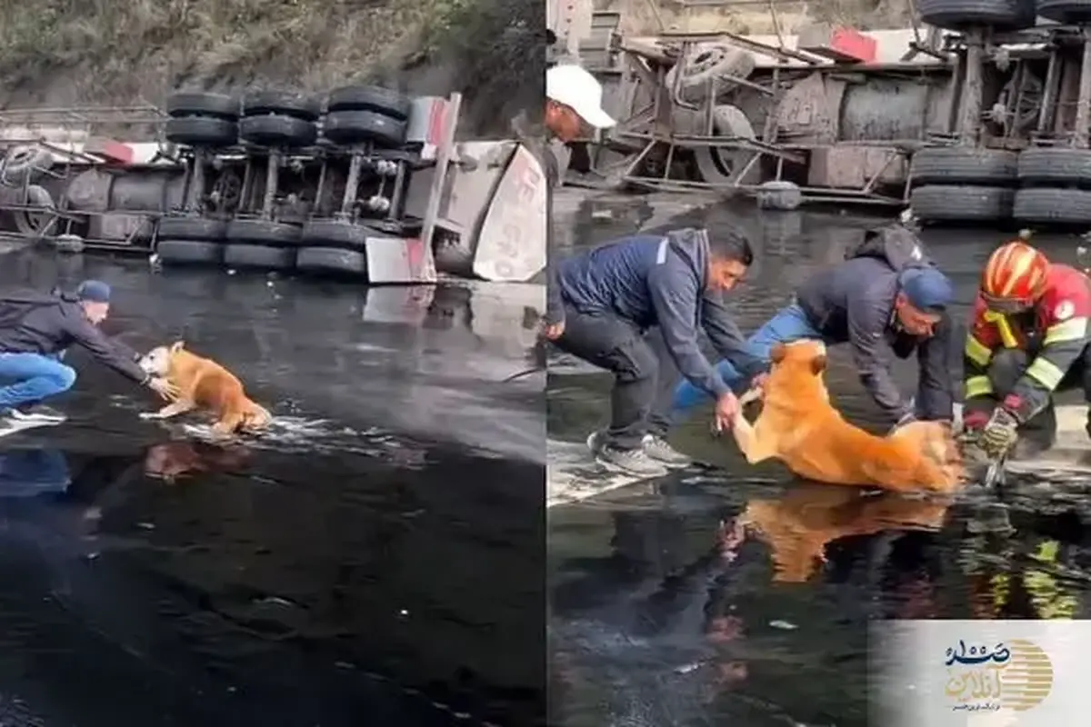 ببینید/ نجات معجزهآسای سگی که پس از واژگونی کامیون در قیر گرفتار شده بود