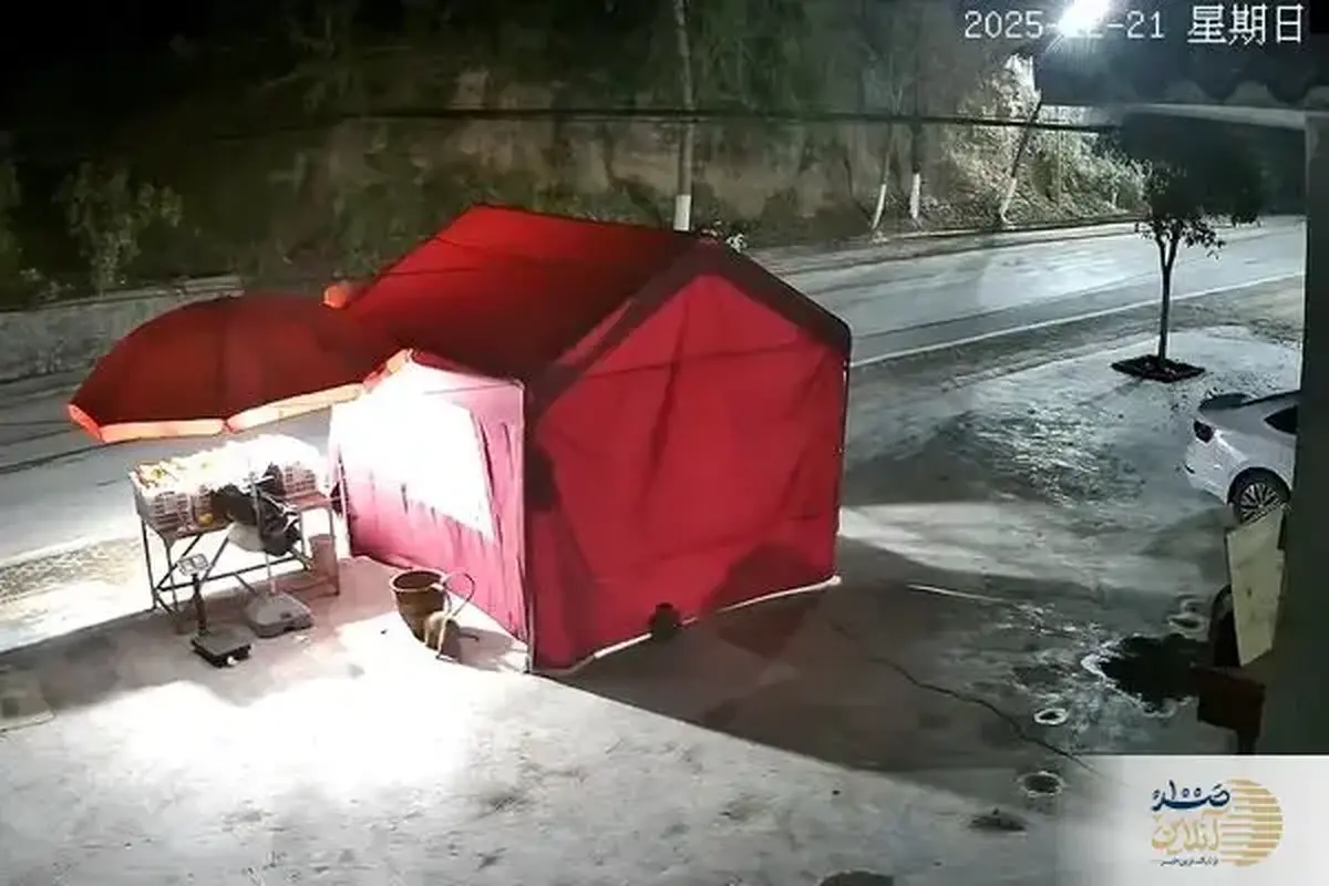 تصاویر دوربین مداربسته در یک خیابان لحظه برخورد یک خودرو با چادر فروشنده غذای خیابانی را ضبط کرده است.