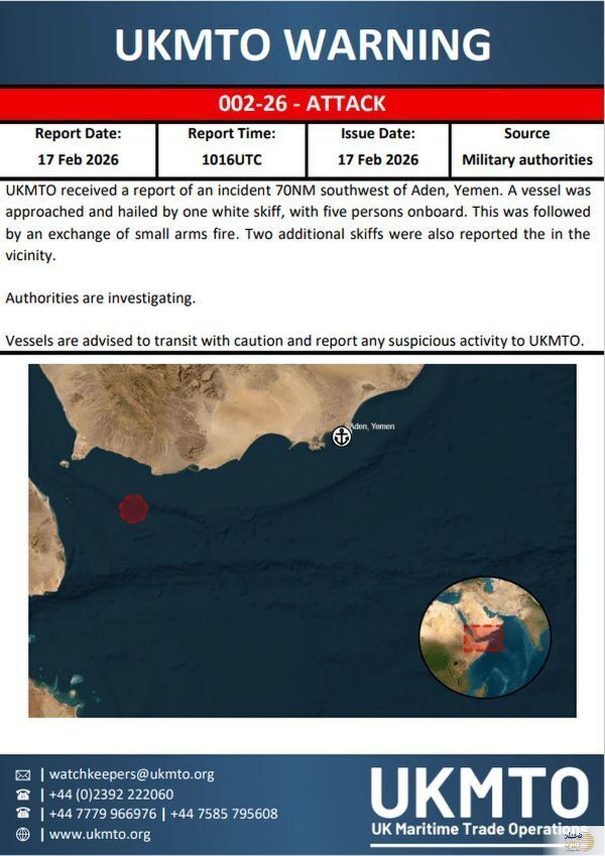 به گزارش صد آنلاین ، آژانس عملیات تجارت دریایی انگلیس از دریافت گزارشی اولیه درباره وقوع یک حادثه در ۷۰ مایلی جنوب غربی عدن، یمن خبر داد.