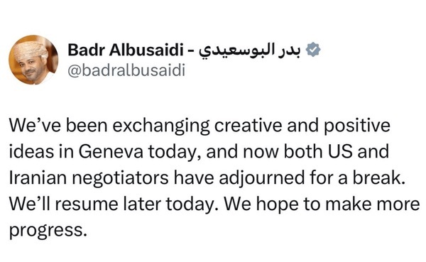 بدر البوسعیدی وزیر خارجه عمان هم لحظاتی پیش خبر داد که هیأتهای مذاکره کننده جمهوری اسلامی ایران و آمریکا در ژنو، ایده‌های خلاقانه و مثبتی را تبادل کردند.