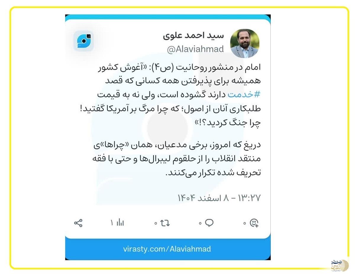 به گزارش خبرنگار سیاسی صد آنلاین، سید احمد علوی، عضو شورای اسلامی شهر تهران، در صفحه شخصی خود در پلتفرم «ویراستی»، با اشاره به بخشی از منشور روحانیت امام خمینی(ره)، نسبت به تکرار سخنان منتقدان انقلاب توسط برخی مدعیان امروز هشدار داد.